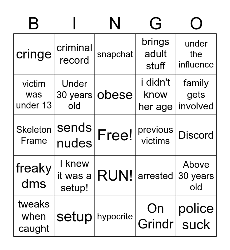 This bingo card has a free space and 24 words: I knew it was a setup!, setup, obese, tweaks when caught, under the influence, cringe, victim was under 13, criminal record, previous victims, RUN!, i didn't know her age, Skeleton Frame, arrested, Above 30 years old, Under 30 years old, On Grindr, Discord, snapchat, family gets involved, sends nudes, police suck, freaky dms, brings adult stuff and hypocrite.