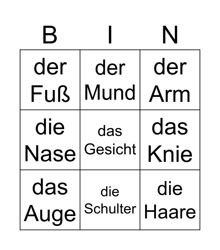 This bingo card has 15 words: der Kopf, das Bein, der Arm, der Fuß, die Schulter, das Gesicht, die Hand, der Finger, das Knie, die Haare, der Bauch, die Nase, das Auge, der Mund and das Ohr.