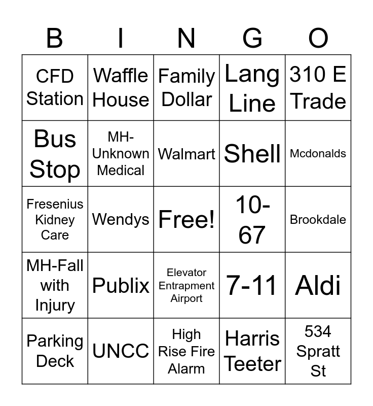 This bingo card has a free space and 42 words: Walgreens, Walmart, Food Lion, Publix, Harris Teeter, Aldi, 534 Spratt St, 1000 Baxter St, Family Dollar, Elevator Entrapment Airport, Brookdale, Mcdonalds, Wendys, 310 E Trade, 429 or 501 Billingsly, 7-11, QT, Fresenius Kidney Care, Circle K, Waffle House, Bus Stop, 575 Clanton Rd, Car Wash, CFD Station, Any Atrium Facility, Any Novant Facility, Shell, AMF, Dunkin Donuts, MH-Assault, MVA on Freeway, MH-Fall with Injury, MH-Unknown Medical, High Rise Fire Alarm, Calling TDA02 “tiller” on the radio, Parking Deck, UNCC, 10-67, PLOT, Any CMS school, Lang Line and Any Hotel/Motel.