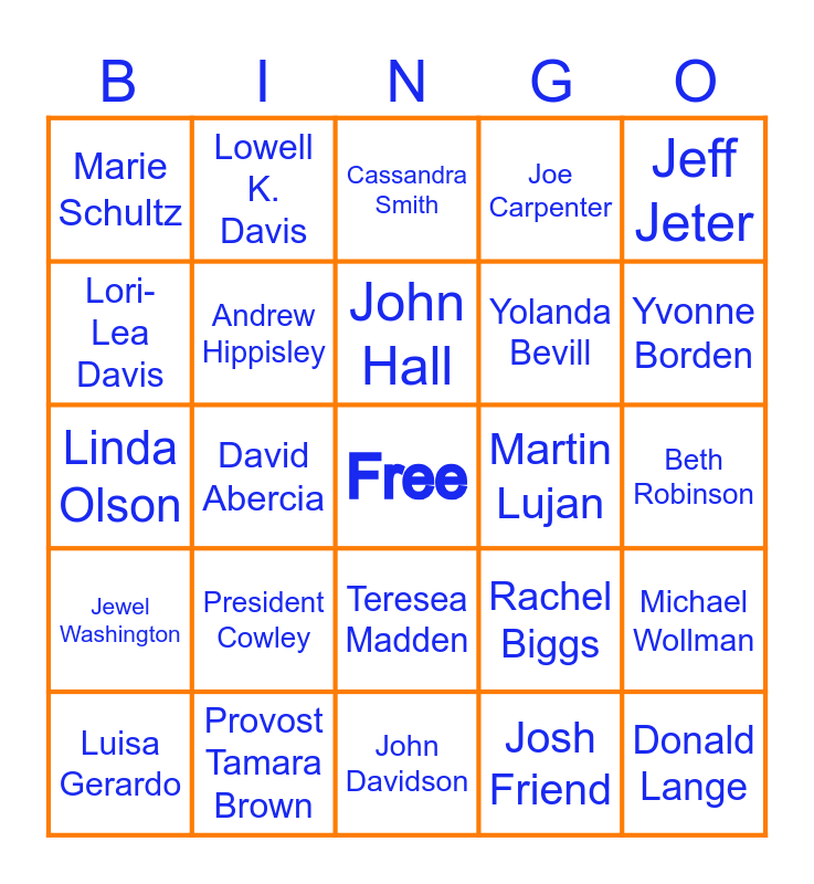 This bingo card has a free space and 24 words: President Cowley, Provost Tamara Brown, John Hall, Luisa Gerardo, Jeff Jeter, Marie Schultz, Lori-Lea Davis, Lowell K. Davis, Martin Lujan, Teresea Madden, Yolanda Bevill, Linda Olson, Rachel Biggs, Michael Wollman, Andrew Hippisley, Josh Friend, Beth Robinson, Cassandra Smith, Yvonne Borden, David Abercia, Donald Lange, Jewel Washington, Joe Carpenter and John Davidson.