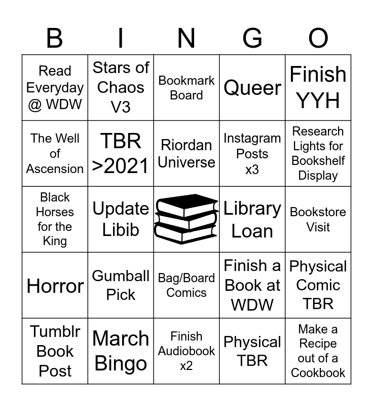 This bingo card has a free space and 24 words: Gumball Pick, March Bingo, Riordan Universe, Tumblr Book Post, Finish YYH, Read Everyday @ WDW, The Well of Ascension, Stars of Chaos V3, Library Loan, Bag/Board Comics, Instagram Posts x3, Black Horses for the King, Finish a Book at WDW, Physical Comic TBR, TBR >2021, Physical TBR, Bookstore Visit, Bookmark Board, Research Lights for Bookshelf Display, Update Libib, Make a Recipe out of a Cookbook, Horror, Queer and Finish Audiobook x2.