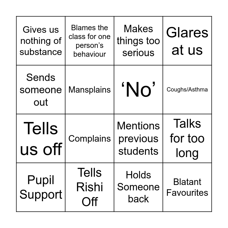 This bingo card has 16 words: Tells Rishi Off, Talks for too long, Makes things too serious, Gives us nothing of substance, Tells us off, Blames the class for one person’s behaviour, Mentions previous students, Holds Someone back, Sends someone out, Mansplains, Pupil Support, Glares at us, Complains, Coughs/Asthma, ‘No’ and Blatant Favourites.