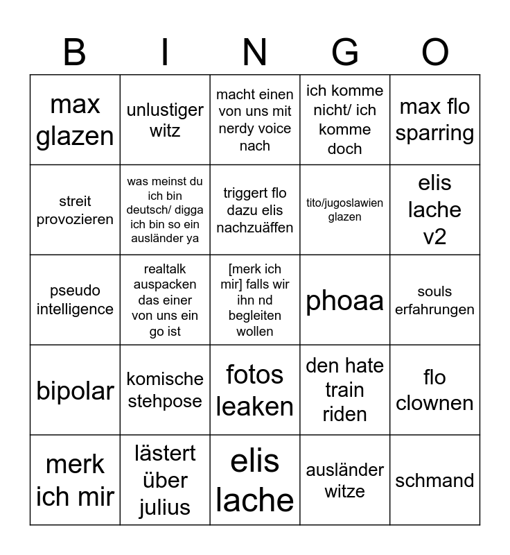 This bingo card has 25 words: komische stehpose, elis lache, triggert flo dazu elis nachzuäffen, merk ich mir, max flo sparring, max glazen, streit provozieren, unlustiger witz, phoaa, fotos leaken, tito/jugoslawien glazen, pseudo intelligence, den hate train riden, flo clownen, was meinst du ich bin deutsch/ digga ich bin so ein ausländer ya, schmand, souls erfahrungen, macht einen von uns mit nerdy voice nach, elis lache v2, realtalk auspacken das einer von uns ein go ist, [merk ich mir] falls wir ihn nd begleiten wollen, lästert über julius, bipolar, ich komme nicht/ ich komme doch and ausländer witze.