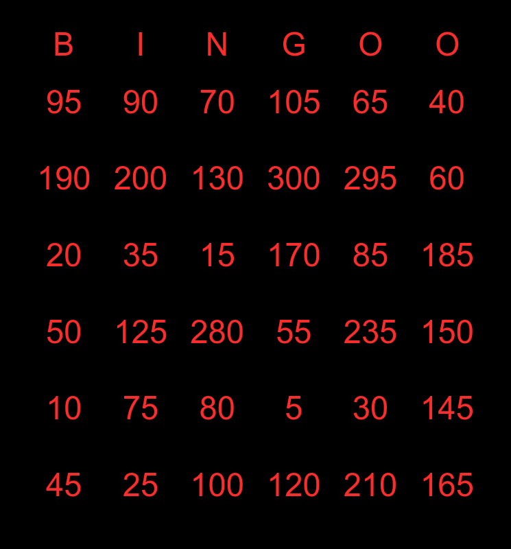This bingo card has 36 words: 5, 80, 120, 190, 50, 170, 200, 100, 65, 30, 60, 105, 145, 35, 300, 95, 10, 85, 20, 70, 15, 125, 55, 280, 235, 90, 295, 25, 130, 40, 165, 45, 150, 185, 75 and 210.