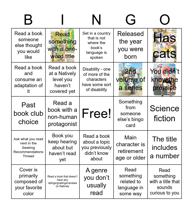 This bingo card has 4 images, a free space and 24 words: Book you keep hearing about but haven’t read yet, Read a book that doesn’t have any ratings/gradings/reviews on Natively, Disability - one of more of the characters have some sort of disability, Cover is primarily composed of your favorite color, Has cats, Read a book someone else thought you would like, Read a book and consume an adaptation of it, Read something with a one-word title, Something from someone else’s bingo card, Read a book about a topic you previously didn’t know about, 2nd volume of a series, Past book club choice, Main character is retirement age or older, The title includes a number, Read a book at a Natively level you haven’t covered yet, Read something related to language in some way, Science fiction, Set in a country that is not where the book’s language is spoken, You didn’t know the premise, Read a book with a non-human protagonist, Read something with a title that sounds curious to you, Ask what you read next in the Seeking Recommendations Thread, Released the year you were born and A genre you don’t usually read.