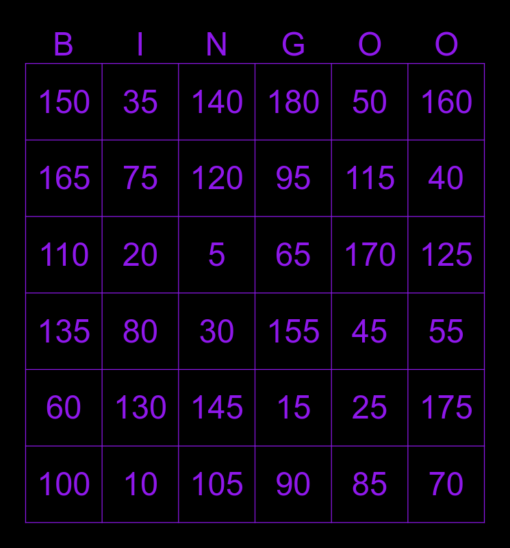 This bingo card has 36 words: 15, 145, 90, 165, 135, 65, 75, 105, 50, 25, 40, 180, 175, 20, 95, 150, 60, 170, 110, 140, 5, 80, 155, 30, 45, 35, 115, 10, 120, 160, 70, 100, 55, 125, 130 and 85.