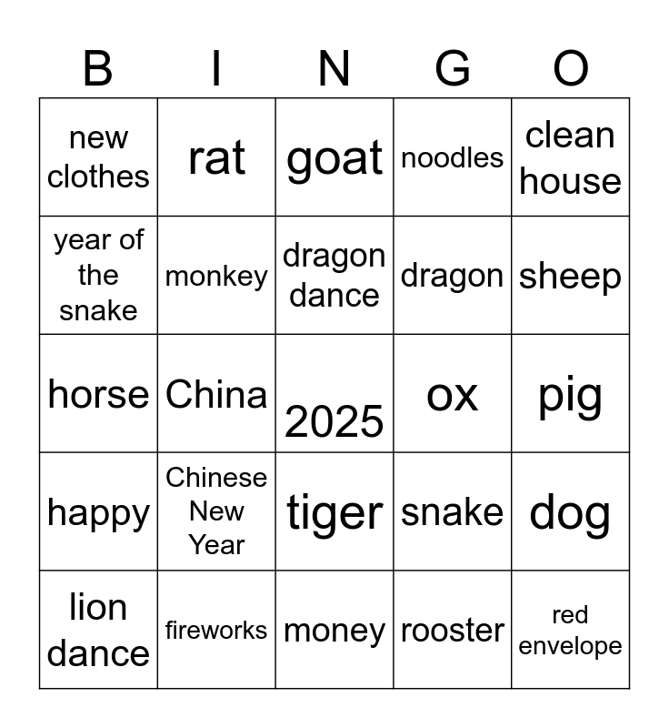 This bingo card has a free space and 24 words: Chinese New Year, fireworks, dragon dance, lion dance, clean house, new clothes, year of the snake, rat, ox, tiger, dragon, horse, snake, dog, monkey, rooster, pig, goat, sheep, China, red envelope, happy, noodles and money.