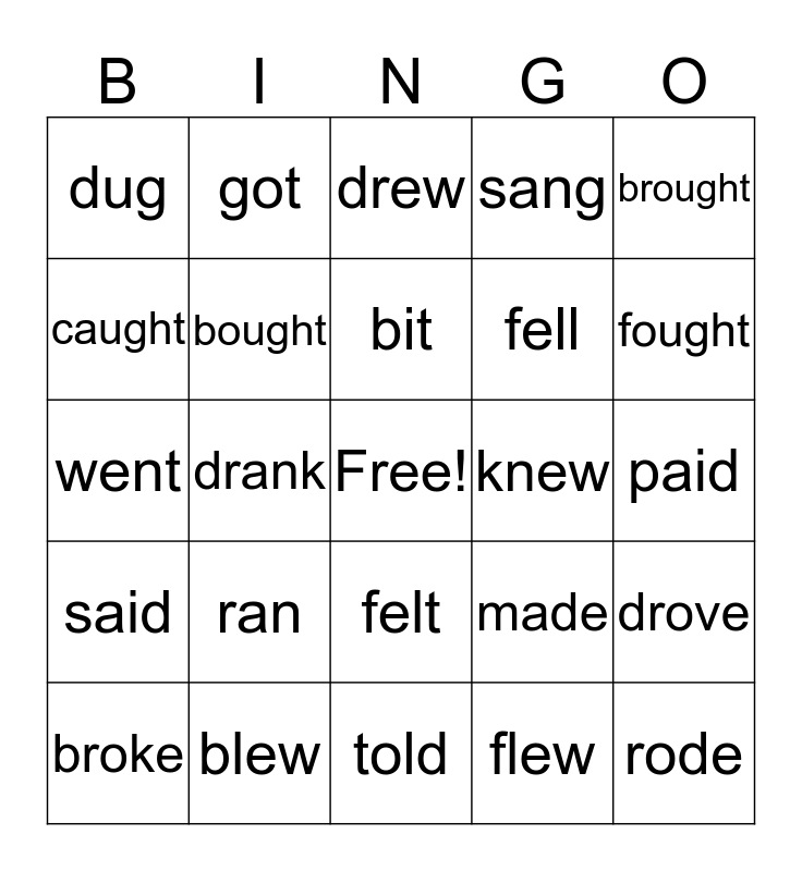 This bingo card has a free space and 24 words: ran, blew, bit, broke, brought, dug, caught, got, knew, felt, fell, went, made, drove, bought, flew, paid, drew, fought, drank, rode, said, sang and told.