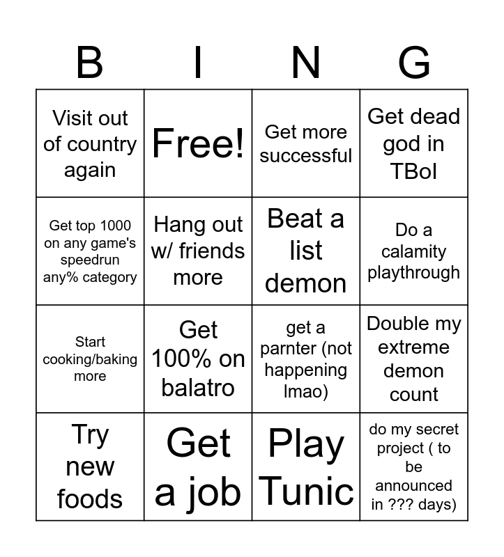 This bingo card has 16 words: Get a job, Double my extreme demon count, Get more successful, Visit out of country again, Start cooking/baking more, Free!, get a parnter (not happening lmao), Play Tunic, Get top 1000 on any game's speedrun any% category, Hang out w/ friends more, Try new foods, Get dead god in TBoI, Get 100% on balatro, Do a calamity playthrough, Beat a list demon and do my secret project ( to be announced in ??? days).