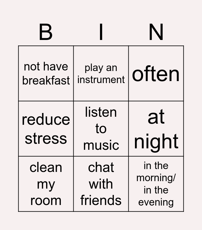 This bingo card has a free space and 8 words: at night, often, play an instrument, clean my room, not have breakfast, in the morning/ in the evening, reduce stress and chat with friends.