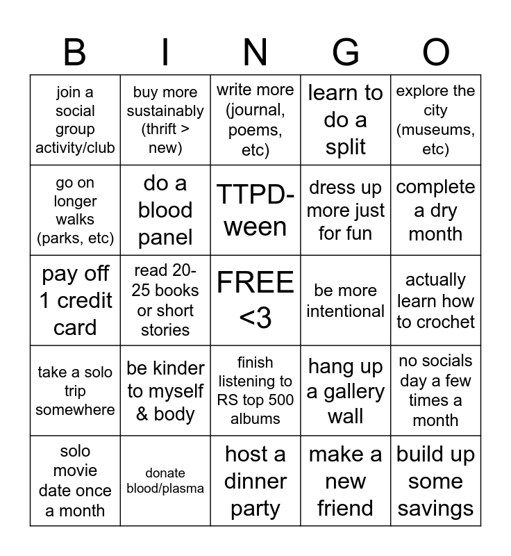 This bingo card has a free space and 24 words: be kinder to myself & body, donate blood/plasma, TTPD- ween, solo movie date once a month, explore the city (museums, etc), join a social group activity/club, go on longer walks (parks, etc), buy more sustainably (thrift > new), be more intentional, finish listening to RS top 500 albums, dress up more just for fun, pay off 1 credit card, hang up a gallery wall, no socials day a few times a month, do a blood panel, make a new friend, actually learn how to crochet, write more (journal, poems, etc), complete a dry month, read 20-25 books or short stories, build up some savings, take a solo trip somewhere, learn to do a split and host a dinner party.