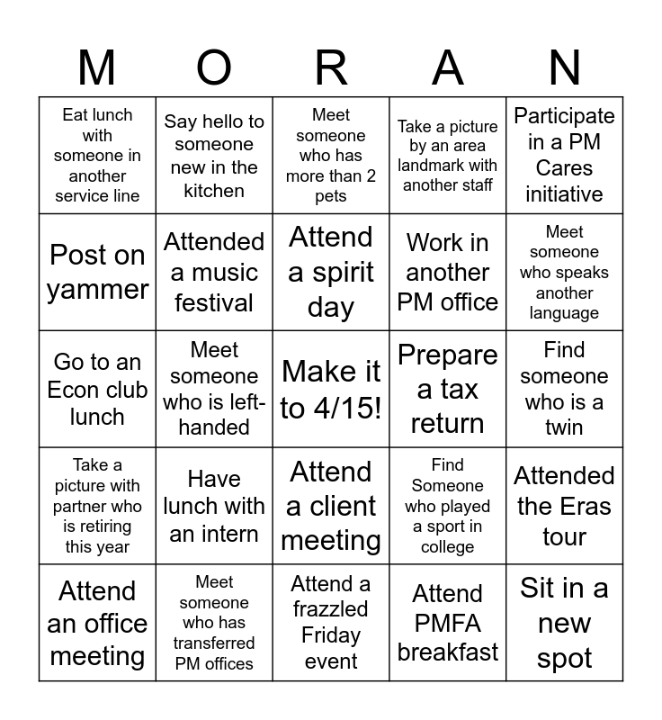 This bingo card has a free space and 25 words: Have lunch with an intern, Attend a frazzled Friday event, Attend a spirit day, Attend an office meeting, Participate in a PM Cares initiative, Eat lunch with someone in another service line, Post on yammer, Say hello to someone new in the kitchen, Prepare a tax return, Attend a client meeting, Work in another PM office, Go to an Econ club lunch, Find Someone who played a sport in college, Attended the Eras tour, Attended a music festival, Find someone who has been to Europe, Find someone who is a twin, Meet someone who has more than 2 pets, Meet someone who speaks another language, Meet someone who is left-handed, Sit in a new spot, Meet someone who has transferred PM offices, Take a picture with partner who is retiring this year, Take a picture by an area landmark with another staff and Attend PMFA breakfast.