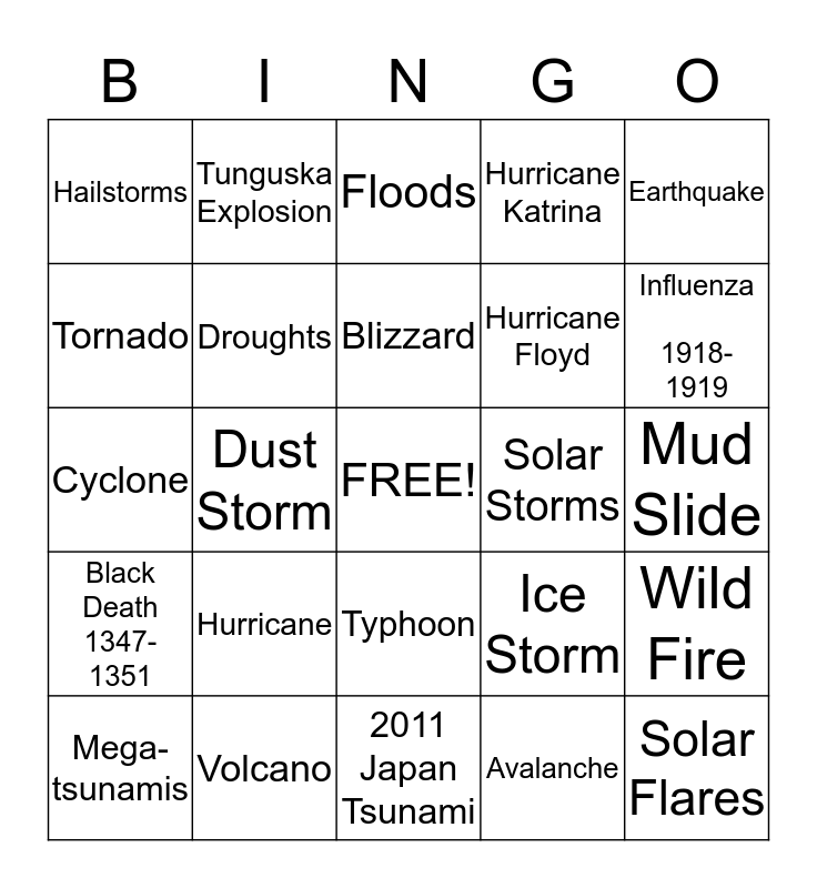 This bingo card has a free space and 24 words: Hurricane, Volcano, Blizzard, Mega- tsunamis, Earthquake, Hailstorms, Tornado, Tunguska Explosion, Solar Storms, Typhoon, Hurricane Floyd, Cyclone, Ice Storm, Wild Fire, Droughts, Avalanche, Mud Slide, Floods, Influenza 1918-1919, Dust Storm, Solar Flares, Black Death 1347-1351, Hurricane Katrina and 2011 Japan Tsunami.