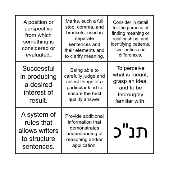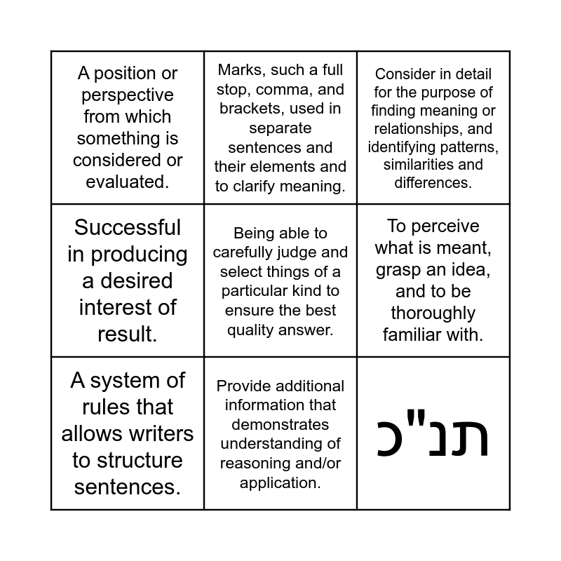 This bingo card has 10 words: Provide additional information that demonstrates understanding of reasoning and/or application., Consider in detail for the purpose of finding meaning or relationships, and identifying patterns, similarities and differences., A position or perspective from which something is considered or evaluated., Being able to carefully judge and select things of a particular kind to ensure the best quality answer., Successful in producing a desired interest of result., A system of rules that allows writers to structure sentences., Marks, such a full stop, comma, and brackets, used in separate sentences and their elements and to clarify meaning., Something that is suggested but not directly expressed., To perceive what is meant, grasp an idea, and to be thoroughly familiar with. and תנ"כ.