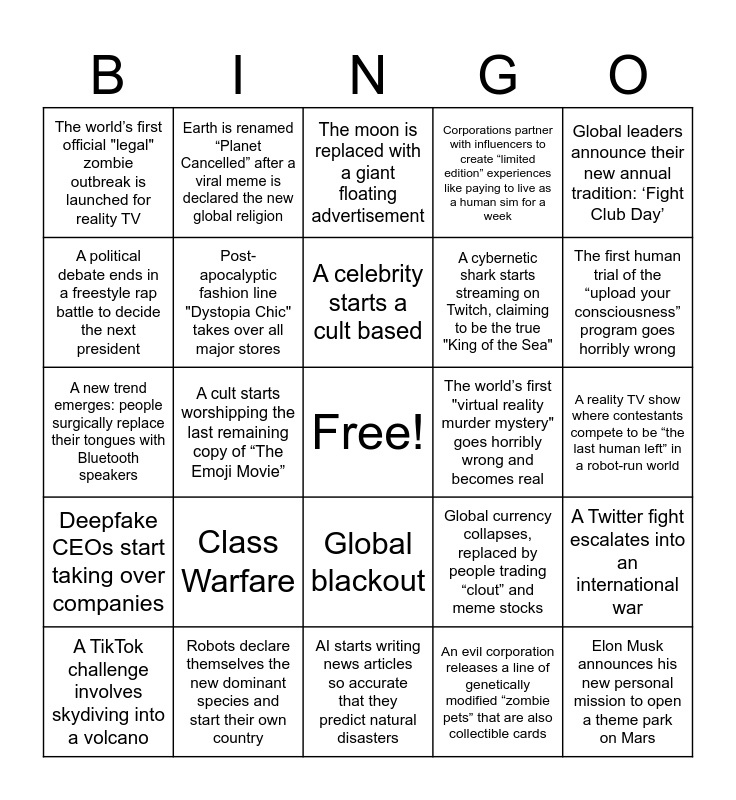 This bingo card has a free space and 24 words: Class Warfare, Robots declare themselves the new dominant species and start their own country, A celebrity starts a cult based, A TikTok challenge involves skydiving into a volcano, Global leaders announce their new annual tradition: ‘Fight Club Day’, The world’s first official "legal" zombie outbreak is launched for reality TV, A political debate ends in a freestyle rap battle to decide the next president, Earth is renamed “Planet Cancelled” after a viral meme is declared the new global religion, The world’s first "virtual reality murder mystery" goes horribly wrong and becomes real, Global blackout, A cybernetic shark starts streaming on Twitch, claiming to be the true "King of the Sea", A new trend emerges: people surgically replace their tongues with Bluetooth speakers, Global currency collapses, replaced by people trading “clout” and meme stocks, A Twitter fight escalates into an international war, Post-apocalyptic fashion line "Dystopia Chic" takes over all major stores, An evil corporation releases a line of genetically modified “zombie pets” that are also collectible cards, A reality TV show where contestants compete to be “the last human left” in a robot-run world, The moon is replaced with a giant floating advertisement, The first human trial of the “upload your consciousness” program goes horribly wrong, A cult starts worshipping the last remaining copy of “The Emoji Movie”, Elon Musk announces his new personal mission to open a theme park on Mars, Deepfake CEOs start taking over companies, Corporations partner with influencers to create “limited edition” experiences like paying to live as a human sim for a week and AI starts writing news articles so accurate that they predict natural disasters.