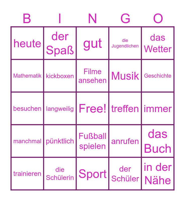 This bingo card has a free space and 39 words: Handball spielen, schwimmen, Klavier spielen, kickboxen, trainieren, Fußball spielen, Filme ansehen, Computerspiele spielen, das Wetter, manchmal, langweilig, die Jugendlichen, in der Nähe, immer, treffen, pünktlich, die Mannschaft, heute, der Erfolg, anrufen, Mathematik, Sport, Musik, Geschichte, Englisch, Deutsch, Biologie, vielleicht, der Unterricht, der Spaß, die Note, die Hausaufgaben, gut, die Schülerin, der Schüler, groß, das Buch, besuchen and aber.