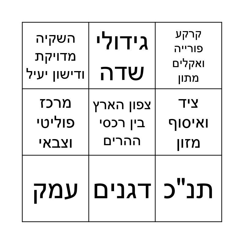 This bingo card has 10 words: דגנים, קרקע פורייה ואקלים מתון, השקיה מדויקת ודישון יעיל, צפון הארץ בין רכסי ההרים, מרכז פוליטי וצבאי, עמק, גידולי שדה, חקלאות, ציד ואיסוף מזון and תנ"כ.