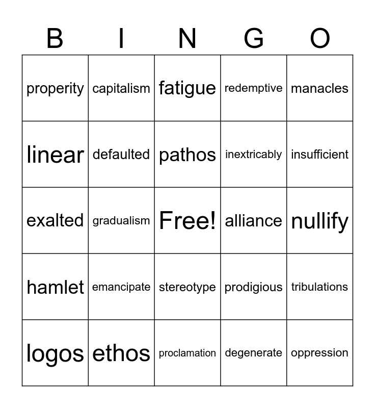 This bingo card has a free space and 24 words: emancipate, ethos, pathos, logos, manacles, properity, linear, capitalism, alliance, stereotype, inextricably, exalted, prodigious, tribulations, defaulted, degenerate, nullify, fatigue, insufficient, gradualism, oppression, hamlet, redemptive and proclamation.