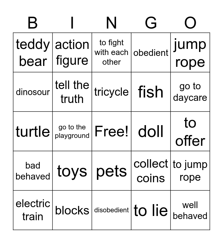 This bingo card has a free space and 24 words: toys, blocks, tricycle, electric train, jump rope, teddy bear, dinosour, action figure, doll, pets, fish, turtle, collect coins, to jump rope, tell the truth, to lie, to offer, to fight with each other, go to daycare, go to the playground, well behaved, bad behaved, obedient and disobedient.