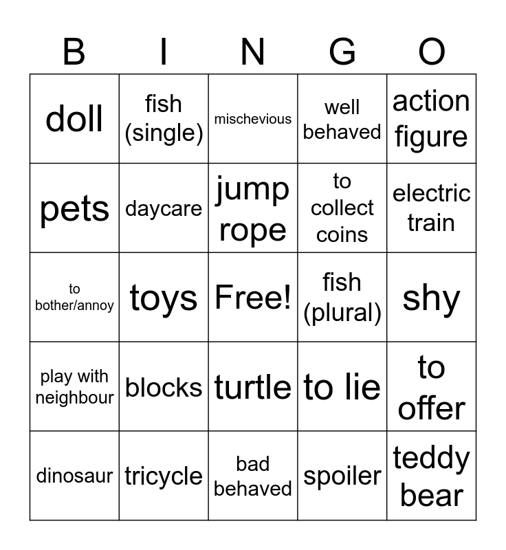 This bingo card has a free space and 24 words: blocks, tricycle, jump rope, dinosaur, action figure, doll, pets, fish (single), fish (plural), turtle, to collect coins, to bother/annoy, to lie, to offer, daycare, spoiler, shy, mischevious, electric train, toys, teddy bear, play with neighbour, well behaved and bad behaved.