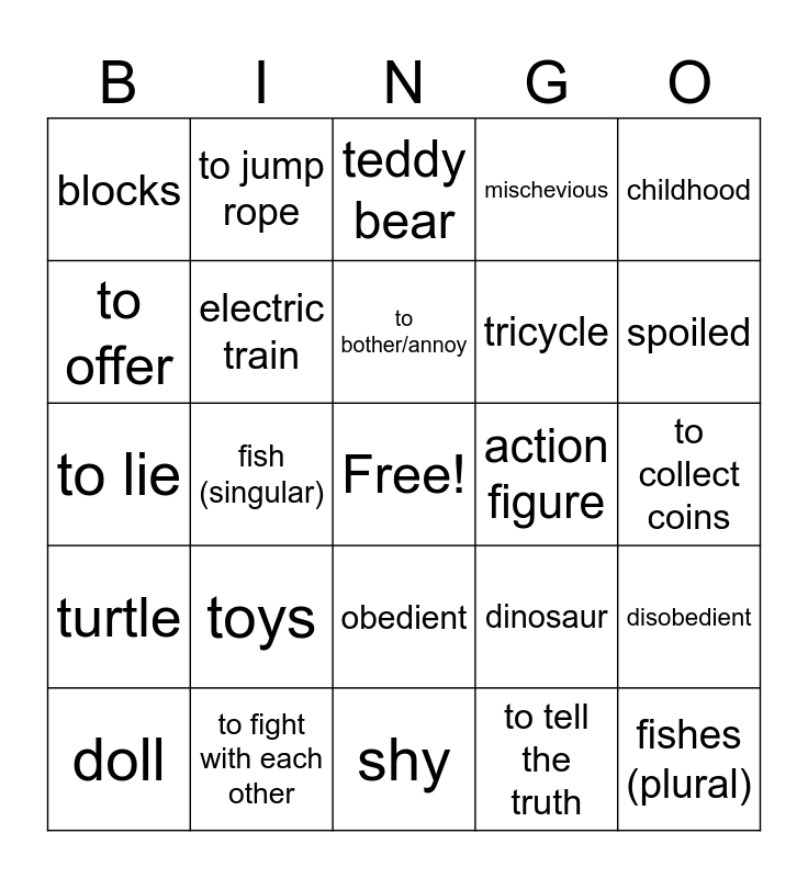 This bingo card has a free space and 24 words: toys, to fight with each other, to bother/annoy, doll, childhood, blocks, to offer, to jump rope, action figure, obedient, tricycle, to lie, dinosaur, disobedient, electric train, to tell the truth, to collect coins, teddy bear, spoiled, fish (singular), fishes (plural), turtle, mischevious and shy.