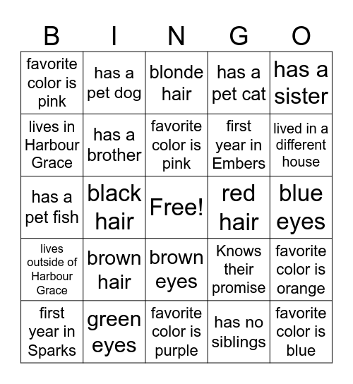 This bingo card has a free space and 24 words: brown hair, green eyes, favorite color is pink, first year in Sparks, has a sister, favorite color is pink, lives in Harbour Grace, has a pet dog, red hair, brown eyes, first year in Embers, has a pet fish, Knows their promise, favorite color is orange, has a brother, has no siblings, blue eyes, blonde hair, lived in a different house, black hair, favorite color is blue, lives outside of Harbour Grace, has a pet cat and favorite color is purple.