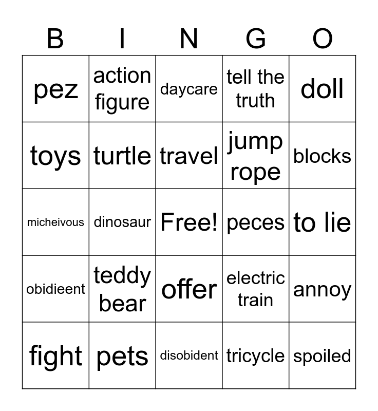 This bingo card has a free space and 24 words: teddy bear, pets, travel, fight, doll, pez, toys, action figure, peces, offer, jump rope, micheivous, electric train, annoy, turtle, tricycle, to lie, daycare, blocks, dinosaur, spoiled, obidieent, tell the truth and disobident.