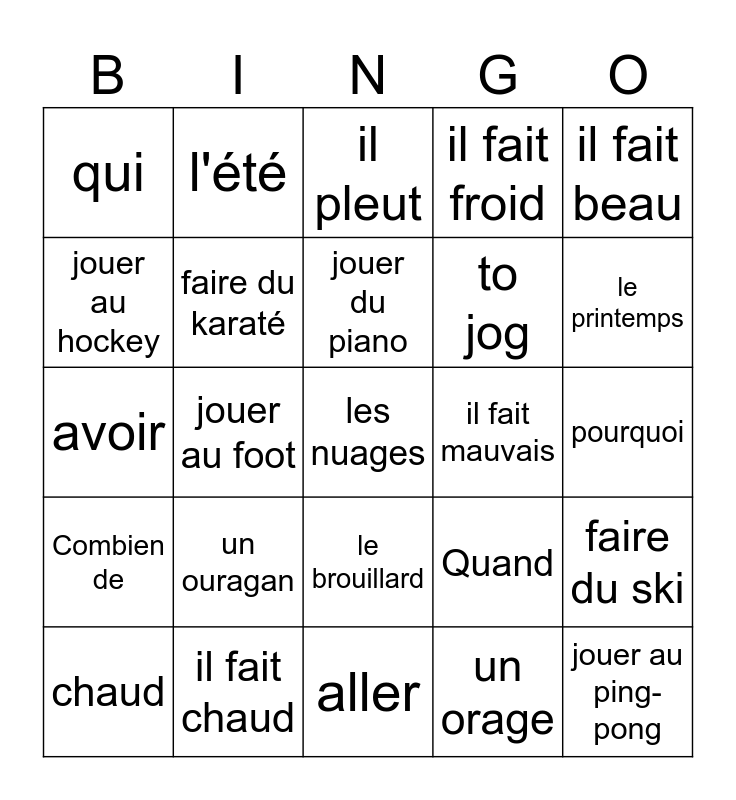 This bingo card has 44 words: le soleil, les nuages, le vent, chaud, froid, un orage, il pleut, il neige, il fait beau, il fait chaud, il fait froid, il fait mauvais, le brouillard, un ouragan, faire, aller, être, avoir, l'automne, le printemps, l'été, l'hiver, jouer, qui, avec qui, pourquoi, comment, Où, Quand, Combien de, jouer aux cartes, faire du ski, faire du vélo, jouer de la guitare, jouer au foot, jouer au tennis, faire du skate, jouer au ping-pong, jouer du piano, jouer au hockey, to jog, jouer aux jeux vidéo, faire du karaté and faire du bowling.