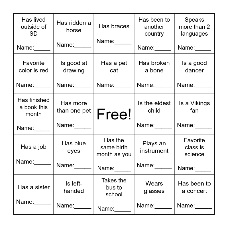 This bingo card has a free space and 24 words: Has blue eyes Name:_____, Is left-handed Name:_____, Has a pet cat Name:_____, Has a sister Name:_____, Speaks more than 2 languages Name:_____, Has lived outside of SD Name:_____, Favorite color is red Name:_____, Has ridden a horse Name:_____, Is the eldest child Name:_____, Has the same birth month as you Name:_____, Has broken a bone Name:_____, Has finished a book this month Name:_____, Plays an instrument Name:_____, Favorite class is science Name:_____, Is good at drawing Name:_____, Wears glasses Name:_____, Is a Vikings fan Name:_____, Has braces Name:_____, Is a good dancer Name:_____, Has more than one pet Name:_____, Has been to a concert Name:_____, Has a job Name:_____, Has been to another country Name:_____ and Takes the bus to school Name:_____.