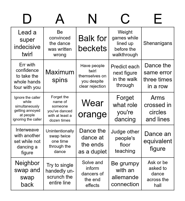 This bingo card has a free space and 24 words: Unintentionally swap twice one time through the dance, Try to single handedly un-scrunch the entire line, Have people twirl themselves on you despite clear rejection, Neighbor swap and swap back, Shenanigans, Lead a super indecisive twirl, Err with confidence to take the whole hands four with you, Be convinced the dance was written wrong, Forget what role you're dancing, Dance the dance at the ends as a duplet, Predict each next figure in the walk through, Ignore the caller while simultaneously getting annoyed at people ignoring the caller, Judge other people's floor teaching, Dance an equivalent figure, Maximum spins, Be grumpy with an allemande connection, Arms crossed in circles and lines, Balk for beckets, Dance the same error three times in a row, Forget the name of someone you've danced with at least a dozen times, Ask or be asked to dance across the hall, Interweave with another set while not dancing a figure, Weight games while lined up before the walkthrough and Solve and inform dancers of the end effects.