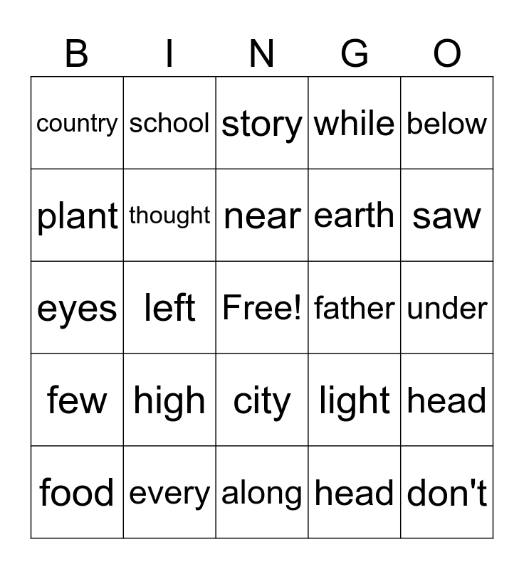 This bingo card has a free space and 24 words: high, every, near, food, below, country, plant, school, father, city, earth, eyes, light, head, thought, head, under, story, saw, left, don't, few, while and along.