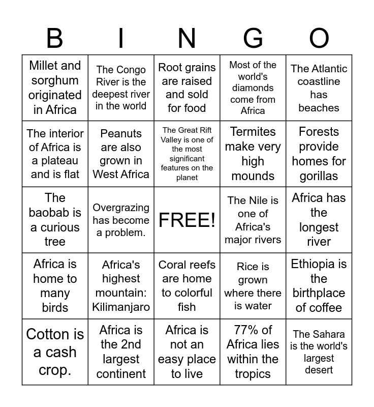This bingo card has a free space and 29 words: Cotton is a cash crop., Sugarcane is cultivated where there is water., Overgrazing has become a problem., When rains fail to come drought grips the land, Millet and sorghum originated in Africa, Root grains are raised and sold for food, Peanuts are also grown in West Africa, Africa's highest mountain: Kilimanjaro, The Nile is one of Africa's major rivers, Africa is the 2nd largest continent, Africa has the longest river, The Sahara is the world's largest desert, Africa is not an easy place to live, 77% of Africa lies within the tropics, Forests provide homes for gorillas, A savanah is a grassy area with few trees, Coral reefs are home to colorful fish, Africa is home to many birds, The Atlantic coastline has beaches, The baobab is a curious tree, Rice is grown where there is water, Corn was brought to Africa from the Americas, Termites make very high mounds, The interior of Africa is a plateau and is flat, Most of the world's diamonds come from Africa, The Congo River is the deepest river in the world, Ethiopia is the birthplace of coffee, The Great Rift Valley is one of the most significant features on the planet and Arabic is the most common language in Africa.