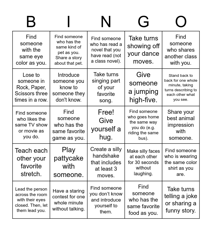 This bingo card has a free space and 26 words: Create a silly handshake that includes at least 3 moves., Find someone who has the same favorite food as you., Take turns singing part of your favorite song., Have a staring contest for one whole minute without talking., Find someone who shares another class with you., Find someone with the same eye color as you., Lose to someone in Rock, Paper, Scissors three times in a row., Find someone who has the same kind of pet as you. Share a story about that pet., Share your best animal impression with someone., Make silly faces at each other for 30 seconds without laughing., Give someone a jumping high-five., Find someone who likes the same TV show or movie as you do., Find someone who is wearing the same color shirt as you are., Lead the person across the room with their eyes closed. Then, let them lead you., Find someone who has the same favorite game as you., Shake hands the proper way with another person., Take turns showing off your dance moves., Teach each other your favorite stretch., Find someone who has read a novel that you have read (not a class novel)., Take turns telling a joke or sharing a funny story., Stand back to back for one whole minute, taking turns describing to each other what you see., Find someone you don’t know and introduce yourself to them., Find someone who goes home the same way you do (e.g. riding the same bus)., Play pattycake with someone., Introduce someone you know to someone they don't know. and Share a story about your summer..