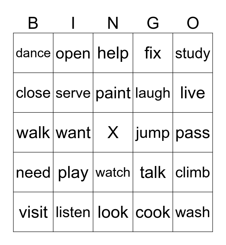 This bingo card has a free space and 24 words: play, listen, paint, visit, study, dance, close, open, jump, watch, laugh, walk, talk, climb, serve, cook, pass, help, live, want, wash, need, fix and look.