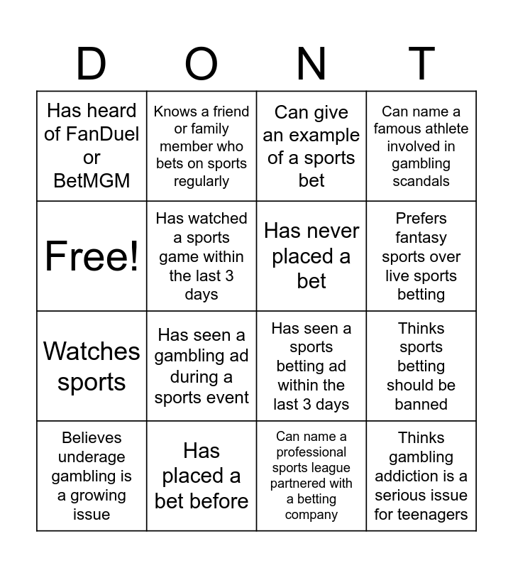 This bingo card has 16 words: Has placed a bet before, Thinks sports betting should be banned, Can give an example of a sports bet, Has heard of FanDuel or BetMGM, Watches sports, Knows a friend or family member who bets on sports regularly, Has seen a sports betting ad within the last 3 days, Can name a professional sports league partnered with a betting company, Free!, Has watched a sports game within the last 3 days, Believes underage gambling is a growing issue, Can name a famous athlete involved in gambling scandals, Has seen a gambling ad during a sports event, Prefers fantasy sports over live sports betting, Has never placed a bet and Thinks gambling addiction is a serious issue for teenagers.