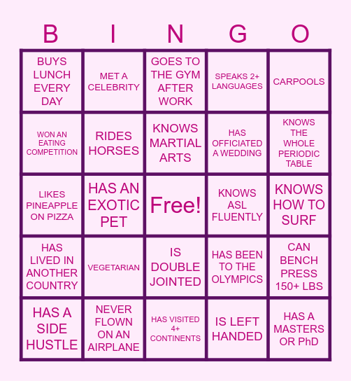 This bingo card has a free space and 24 words: HAS A SIDE HUSTLE, VEGETARIAN, KNOWS MARTIAL ARTS, IS LEFT HANDED, CARPOOLS, BUYS LUNCH EVERY DAY, MET A CELEBRITY, GOES TO THE GYM AFTER WORK, KNOWS ASL FLUENTLY, KNOWS HOW TO SURF, LIKES PINEAPPLE ON PIZZA, RIDES HORSES, HAS BEEN TO THE OLYMPICS, CAN BENCH PRESS 150+ LBS, WON AN EATING COMPETITION, NEVER FLOWN ON AN AIRPLANE, HAS VISITED 4+ CONTINENTS, SPEAKS 2+ LANGUAGES, KNOWS THE WHOLE PERIODIC TABLE, HAS LIVED IN ANOTHER COUNTRY, HAS AN EXOTIC PET, IS DOUBLE JOINTED, HAS OFFICIATED A WEDDING and HAS A MASTERS OR PhD.