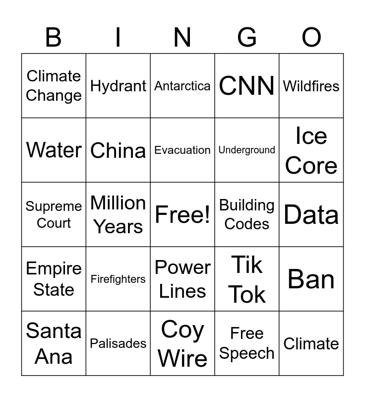 This bingo card has a free space and 24 words: Firefighters, Palisades, Evacuation, Santa Ana, Wildfires, Climate Change, Water, Hydrant, Building Codes, Power Lines, Underground, Supreme Court, Tik Tok, Ban, China, Free Speech, Data, Antarctica, Ice Core, Million Years, Climate, Empire State, CNN and Coy Wire.