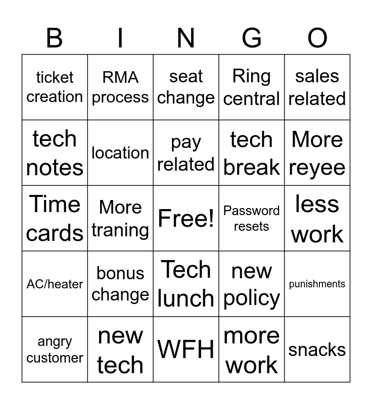 This bingo card has a free space and 24 words: bonus change, new tech, pay related, angry customer, sales related, ticket creation, tech notes, RMA process, Password resets, Tech lunch, tech break, Time cards, new policy, punishments, location, more work, less work, seat change, More reyee, More traning, snacks, AC/heater, Ring central and WFH.