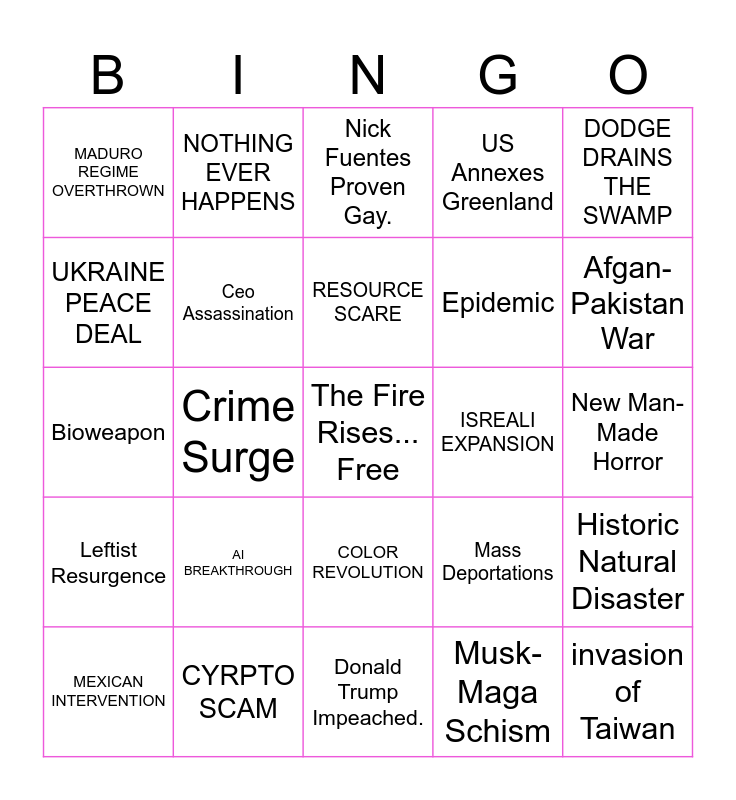 This bingo card has a free space and 24 words: AI BREAKTHROUGH, CYRPTO SCAM, RESOURCE SCARE, MEXICAN INTERVENTION, DODGE DRAINS THE SWAMP, MADURO REGIME OVERTHROWN, UKRAINE PEACE DEAL, NOTHING EVER HAPPENS, ISREALI EXPANSION, COLOR REVOLUTION, Epidemic, Bioweapon, Mass Deportations, Historic Natural Disaster, Ceo Assassination, Musk-Maga Schism, New Man-Made Horror, Nick Fuentes Proven Gay., Afgan-Pakistan War, Crime Surge, invasion of Taiwan, Leftist Resurgence, US Annexes Greenland and Donald Trump Impeached..
