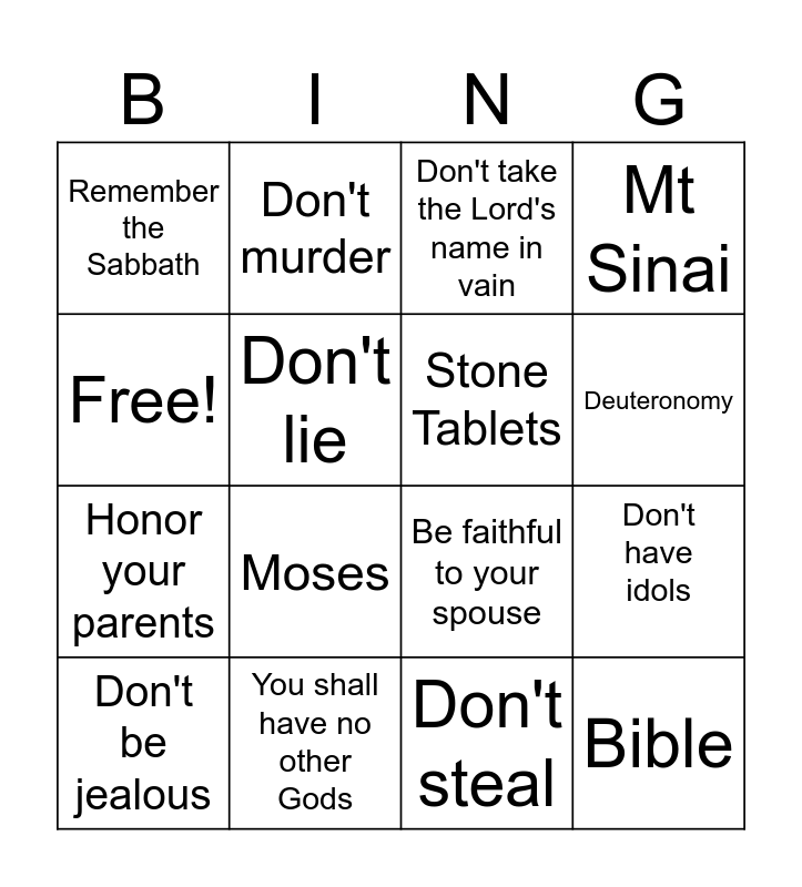 This bingo card has 16 words: You shall have no other Gods, Don't have idols, Don't take the Lord's name in vain, Remember the Sabbath, Honor your parents, Don't murder, Be faithful to your spouse, Don't steal, Free!, Don't lie, Don't be jealous, Mt Sinai, Moses, Deuteronomy, Stone Tablets and Bible.
