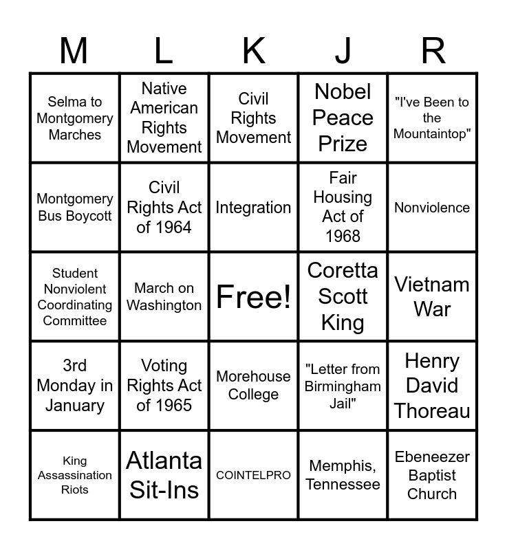 This bingo card has a free space and 39 words: January 15, 1929, Civil Disobedience, "I Have a Dream", Civil Rights Act of 1964, King Assassination Riots, Morehouse College, Integration, Jim Crow Laws, "I've Been to the Mountaintop", 3rd Monday in January, March on Washington, Nobel Peace Prize, Ebeneezer Baptist Church, Vietnam War, Coretta Scott King, Voting Rights Act of 1965, April 4, 1968, Selma to Montgomery Marches, Segregation, "Letter from Birmingham Jail", Montgomery Bus Boycott, COINTELPRO, Fair Housing Act of 1968, Nonviolence, Southern Christian Leadership Conference, Poor People's Campaign, NAACP, Police Brutality, Mahatma Gandhi, Native American Rights Movement, Reparations for Slavery, 16th Street Baptist Church Bombing, Civil Rights Movement, Atlanta Sit-Ins, Memphis, Tennessee, Atlanta, Georgia, Henry David Thoreau, Student Nonviolent Coordinating Committee and Stride Toward Freedom.