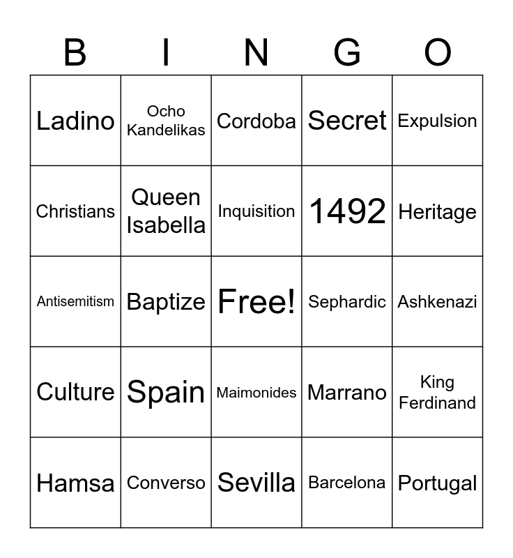 This bingo card has a free space and 24 words: Spain, Converso, Inquisition, Hamsa, Expulsion, Ladino, Christians, Ocho Kandelikas, Sephardic, Maimonides, 1492, Antisemitism, Marrano, King Ferdinand, Queen Isabella, Barcelona, Ashkenazi, Cordoba, Heritage, Baptize, Portugal, Culture, Secret and Sevilla.