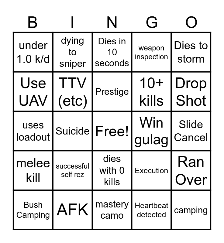 This bingo card has a free space and 24 words: successful self rez, AFK, Prestige, Bush Camping, Dies to storm, under 1.0 k/d, Use UAV, dying to sniper, Win gulag, dies with 0 kills, 10+ kills, uses loadout, Execution, Ran Over, TTV (etc), Heartbeat detected, Slide Cancel, Dies in 10 seconds, Drop Shot, Suicide, camping, melee kill, weapon inspection and mastery camo.