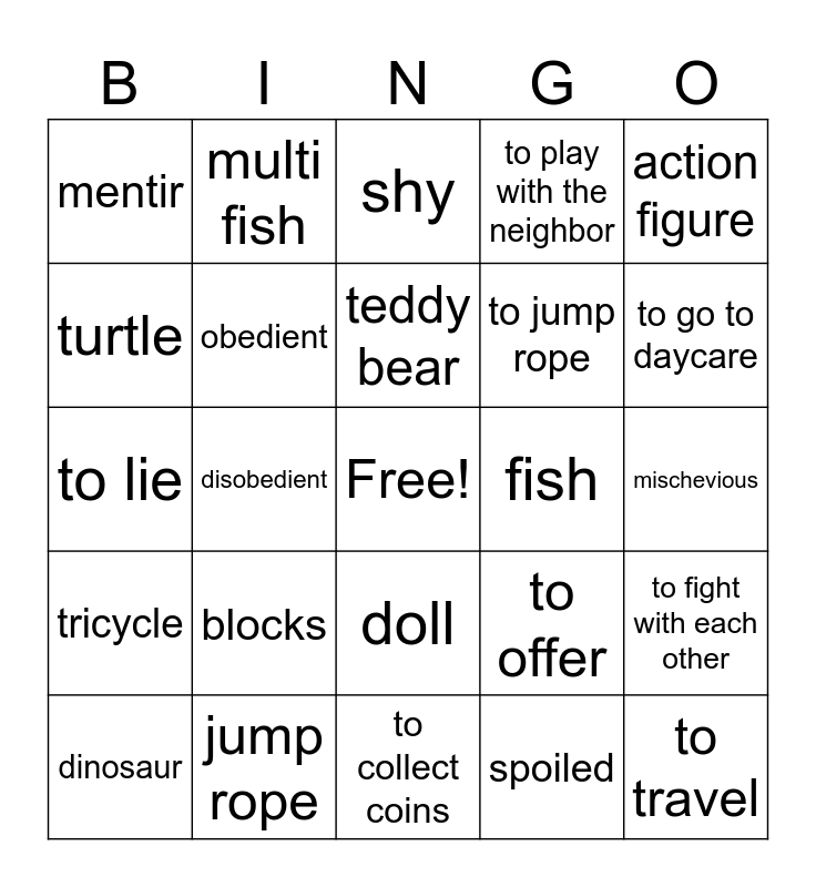 This bingo card has a free space and 24 words: blocks, jump rope, teddy bear, dinosaur, action figure, mentir, turtle, multi fish, fish, doll, to jump rope, to lie, to offer, to fight with each other, obedient, spoiled, mischevious, shy, to go to daycare, disobedient, to travel, tricycle, to play with the neighbor and to collect coins.