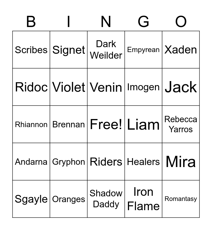 This bingo card has a free space and 34 words: Fourth Wing, Iron Flame, Onyx Storm, Tairn, Andarna, Violet, Xaden, Sgayle, Signet, Lightning, Venin, Dark Weilder, Parapet, War Games, Liam, Jack, Oranges, Rhiannon, Gryphon, Healers, Riders, Infantry, Scribes, Rebecca Yarros, Shadow Daddy, Romantasy, Empyrean, Basgiath, Imogen, Ridoc, Sawyer, Brennan, Mira and Dain.