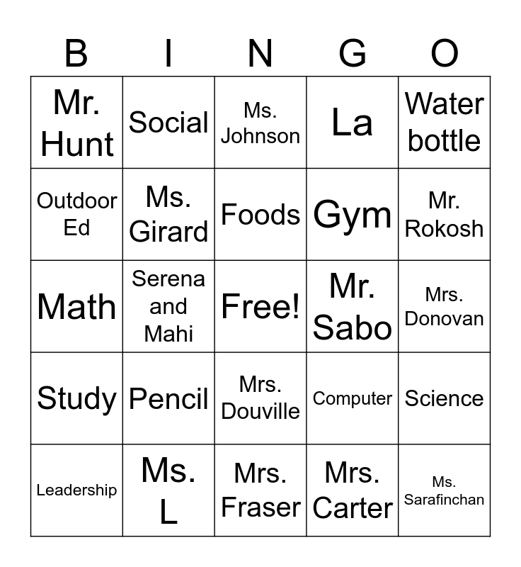 This bingo card has a free space and 30 words: Ms. L, Mr. Dotinga, Serena and Mahi, Mr. Salter, Mr. Hunt, Ms. Johnson, Ms. Girard, Mrs. Douville, Mr. Sabo, Mrs. Fraser, Mrs. Donovan, Ms. Sarafinchan, Mrs. Carter, Mr. Turchenek, Mr. Rokosh, Book, Computer, Study, Pencil, Water bottle, Math, Eraser, Social, Gym, Outdoor Ed, La, Science, Leadership, Foods and Art.