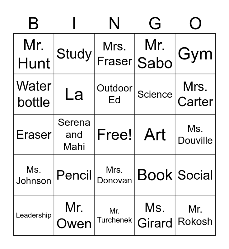 This bingo card has a free space and 30 words: Mr. Owen, Mr. Dotinga, Serena and Mahi, Ms. L, Mr. Hunt, Mrs. Fraser, La, Mrs. Donovan, Art, Mr. Turchenek, Ms. Douville, Mr. Rokosh, Ms. Girard, Ms. Sarafinchan, Mrs. Carter, Computer, Book, Ms. Johnson, Pencil, Gym, Eraser, Math, Study, Science, Water bottle, Mr. Sabo, Social, Leadership, Outdoor Ed and Foods.