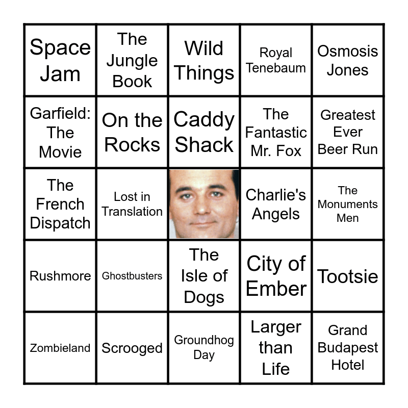 This bingo card has a free space and 24 words: Ghostbusters, Scrooged, Caddy Shack, Zombieland, Osmosis Jones, Space Jam, Garfield: The Movie, The Jungle Book, Charlie's Angels, The Isle of Dogs, The Fantastic Mr. Fox, The French Dispatch, City of Ember, Tootsie, On the Rocks, Larger than Life, The Monuments Men, Wild Things, Greatest Ever Beer Run, Lost in Translation, Grand Budapest Hotel, Rushmore, Royal Tenebaum and Groundhog Day.