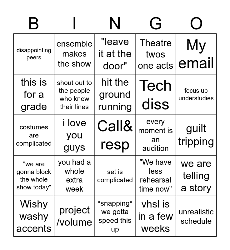 This bingo card has a free space and 24 words: you had a whole extra week, project /volume, hit the ground running, Wishy washy accents, My email, disappointing peers, this is for a grade, ensemble makes the show, every moment is an audition, set is complicated, Tech diss, costumes are complicated, "We have less rehearsal time now", we are telling a story, shout out to the people who knew their lines, vhsl is in a few weeks, guilt tripping, "leave it at the door", focus up understudies, i love you guys, unrealistic schedule, "we are gonna block the whole show today", Theatre twos one acts and *snapping* we gotta speed this up.