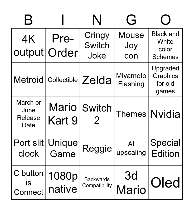 This bingo card has a free space and 24 words: C button is Connect, Unique Game, Zelda, 3d Mario, Black and White color Schemes, 4K output, Pre-Order, Cringy Switch Joke, Themes, Nvidia, March or June Release Date, Collectible, AI upscaling, Special Edition, Metroid, 1080p native, Backwards Compatibility, Mouse Joy con, Upgraded Graphics for old games, Port slit clock, Mario Kart 9, Reggie, Miyamoto Flashing and Oled.